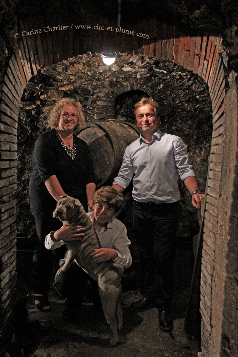 Audrey, Jérôme, Lysandre et Hairbus dans leur cave traditionnelle, Champagne Demière à Fleury-La-Rivière.